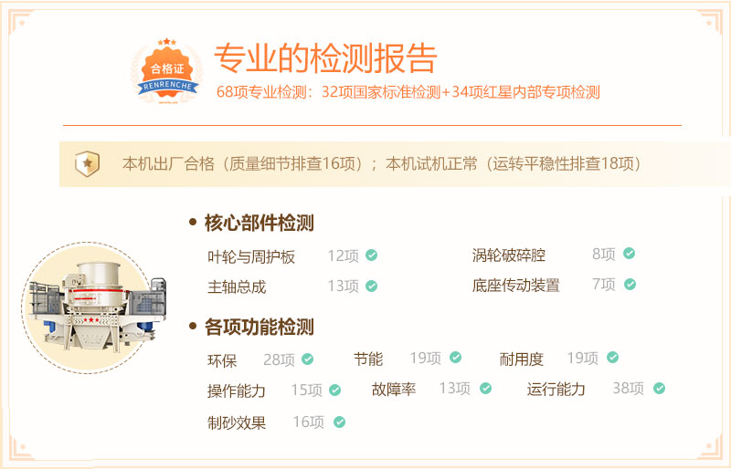 檢驗結(jié)果:經(jīng)專業(yè)檢測,該設(shè)備無論是核心部件還是各項功能均達標,并表現(xiàn)非常良好,核心零部件結(jié)實耐用、壽命長;日常操作靈活便捷、故障少,且具有效能高、高產(chǎn)、節(jié)能、環(huán)保、成品效果好等諸多亮點。設(shè)備綜合情況非常不錯,符合現(xiàn)代化石料廠需求設(shè)備標準。詳細的報告細節(jié)如下: